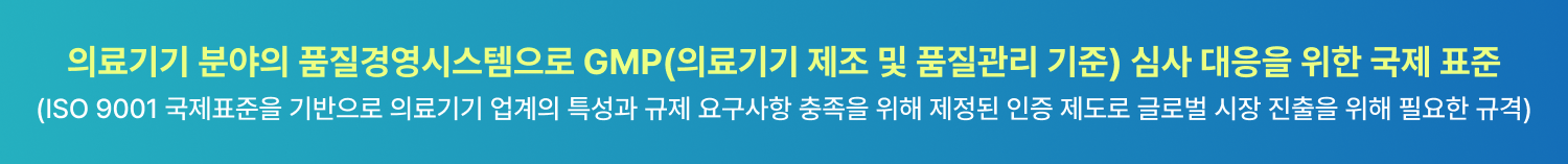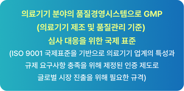 시장 접근성 향상 | 많은 국가에서 의료기기를 시장에 출시하기 위해 ISO 13485 인증을 요구하고 있기 때문에, 인증을 통해 국제 시장에서도 경쟁력을 갖출 수 있습니다. |