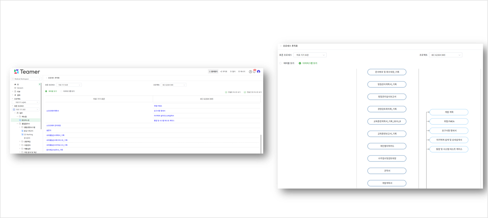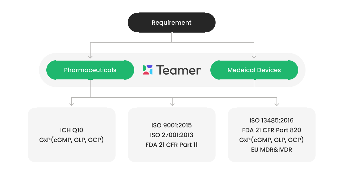 국제표준 규정 준수를 위해 규제 요구사항을 충족시키기 위한 프로세스와 문서 관리, 규정 준수에 대한 추적 및 감사기능을 제공합니다.