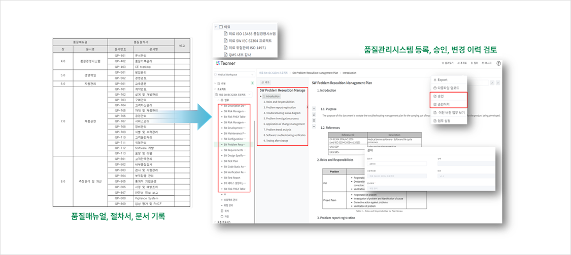 eQMS는 품질관리 효율성 향상을 위해 “개발, 생산, 테스트, 검증 등”의 과정에서 품질관리에 필요한 문서, 절차, 지침의 통합관리 기능을 제공합니다.